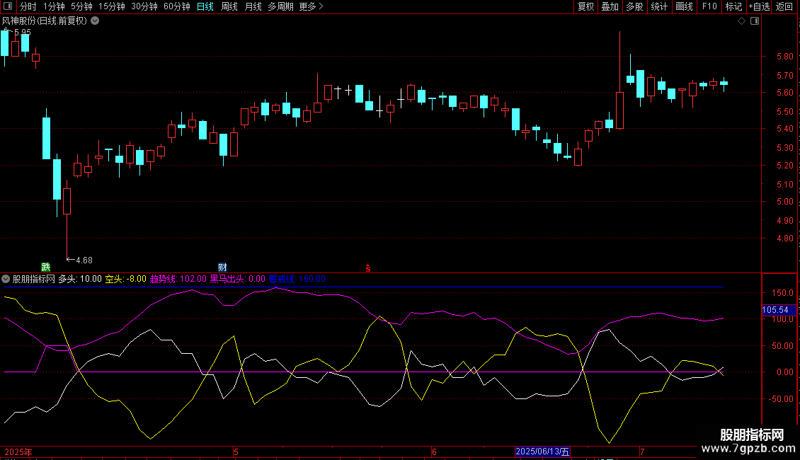 黑马出头:IF(((((CLOSE - MA(CLOSE,8)) / MA(CLOSE,8)) * 100) < (0 - 6.1)),50,0),COLORFF00FF;