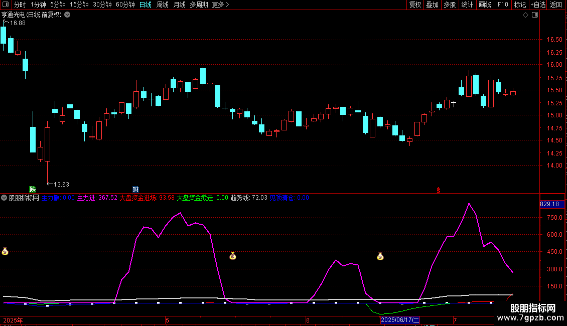 主力进: IF(V4>=0,V4,0)*100,COLORFF00FF,LINETHICK2;