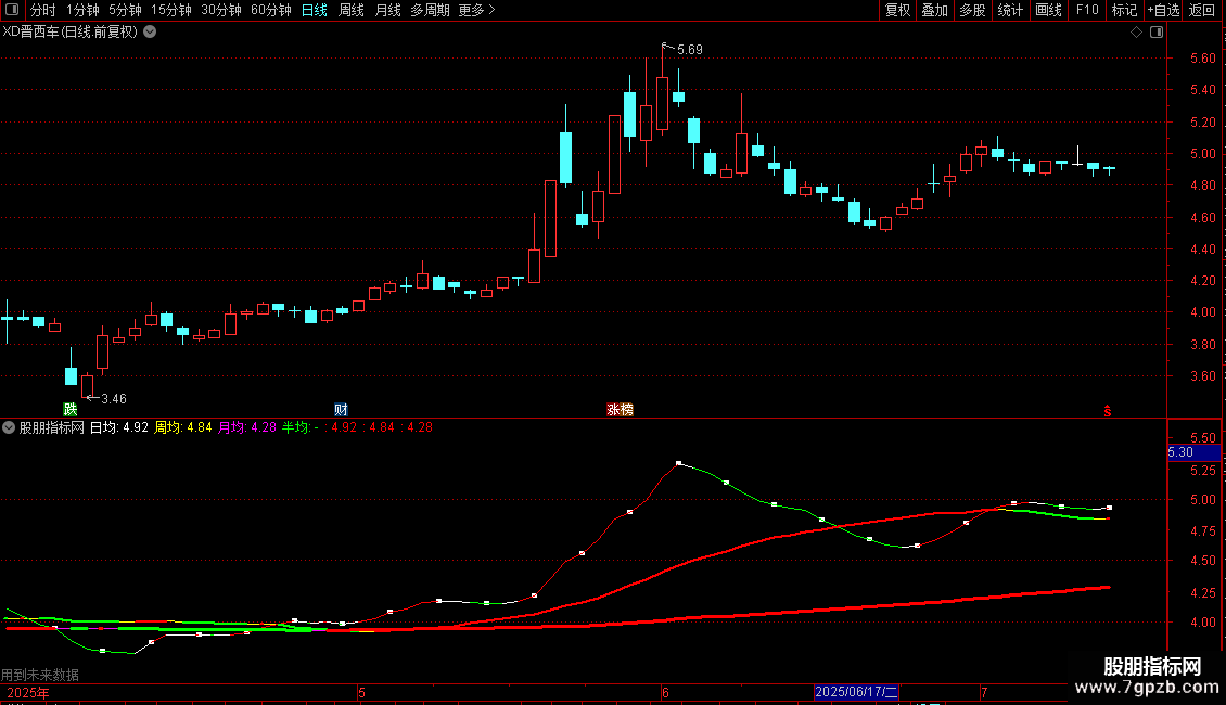IF(半均>REF(半均,1),半均,DRAWNULL),COLORRED,LINETHICK4;