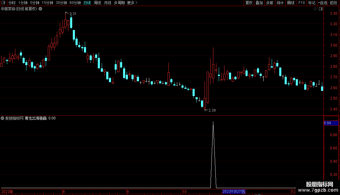 X_5:=NOT(REF(EVERY(CLOSE>REF(CLOSE,1),6),3)) AND REF(OPEN,1)/REF(LOW,1)<1.028 AND REF(CLOSE,1)/REF(LOW,1)<1.04 AND NOT(REF(EVERY(CLOSE>MA(CLOSE,5),10),1)) AND NOT(REF(CLOSE,3)/REF(CLOSE,4)>1.08 AND REF(HIGH,2)>REF(HIGH,3) AND REF(LOW,2)<REF(LOW,3) AND REF(HIGH,2)/REF(LOW,2)>1.12) AND CLOSE>REF(CLOSE,1);