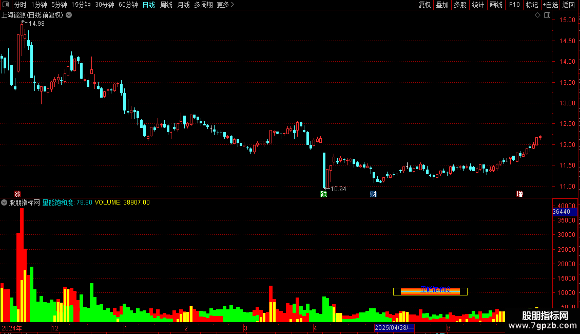 DRAWTEXT(CURRBARSCOUNT=N3,中点*1.82,'量能饱和度'),COLORBLUE;
