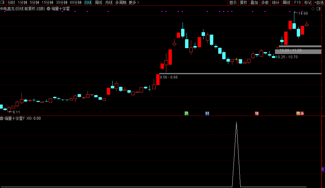 当系统检测到以上条件全部满足时,为了提供直观的视觉信号,主图会显示黄色十字星且下方有红色五角星。这个红色五角星位置就是选股指标要选出的标的,提示用户重点关注。