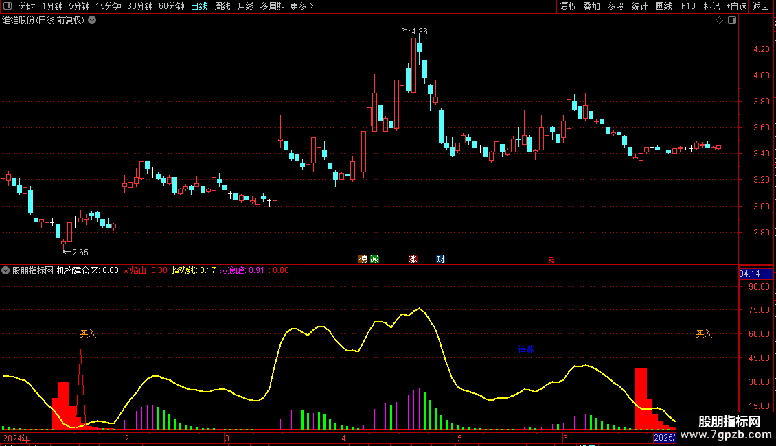 火焰山:EMA(IF(LOW<=VAR7 AND 趋势<40,(VAR11+VAR12),0),3)/618,COLORRED,LINETHICK2;