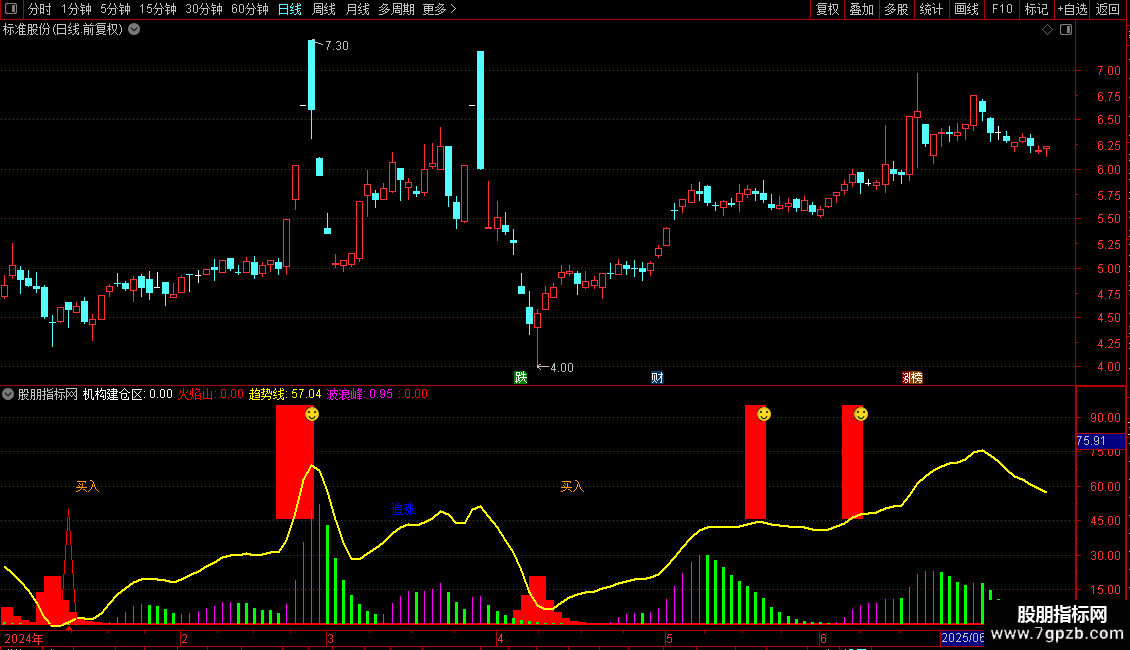 STICKLINE(火焰山>0,0 ,火焰山*1.2,8,0 ),COLORRED;