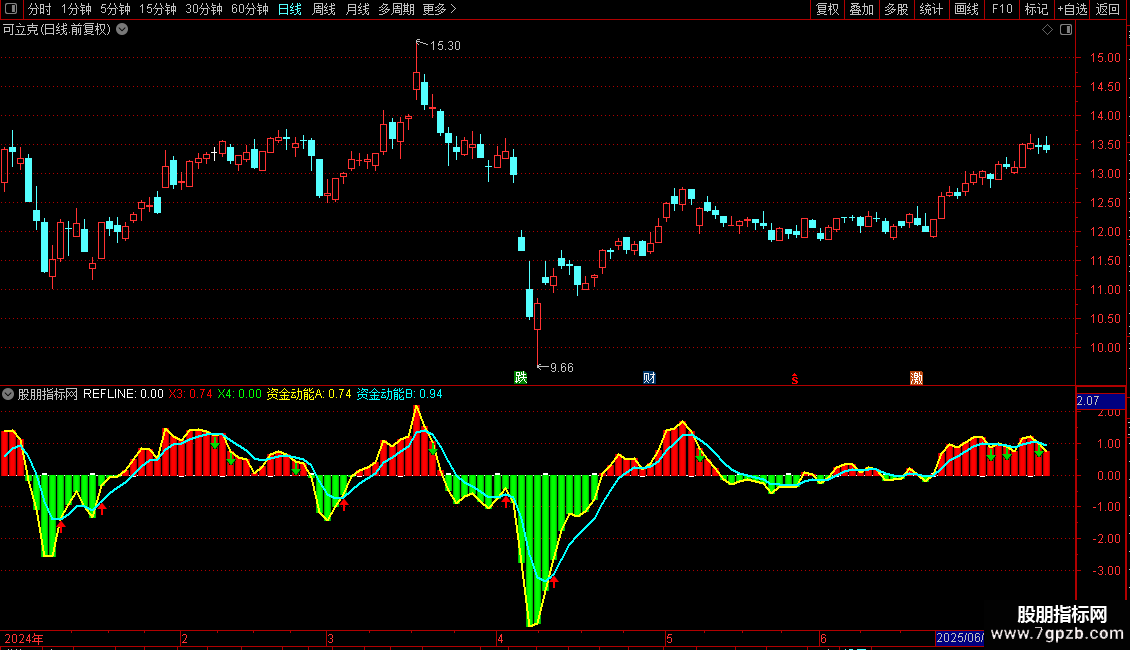 DRAWICON((CROSS(资金动能B,资金动能A) AND 资金动能A>0.25),资金动能A,2);
