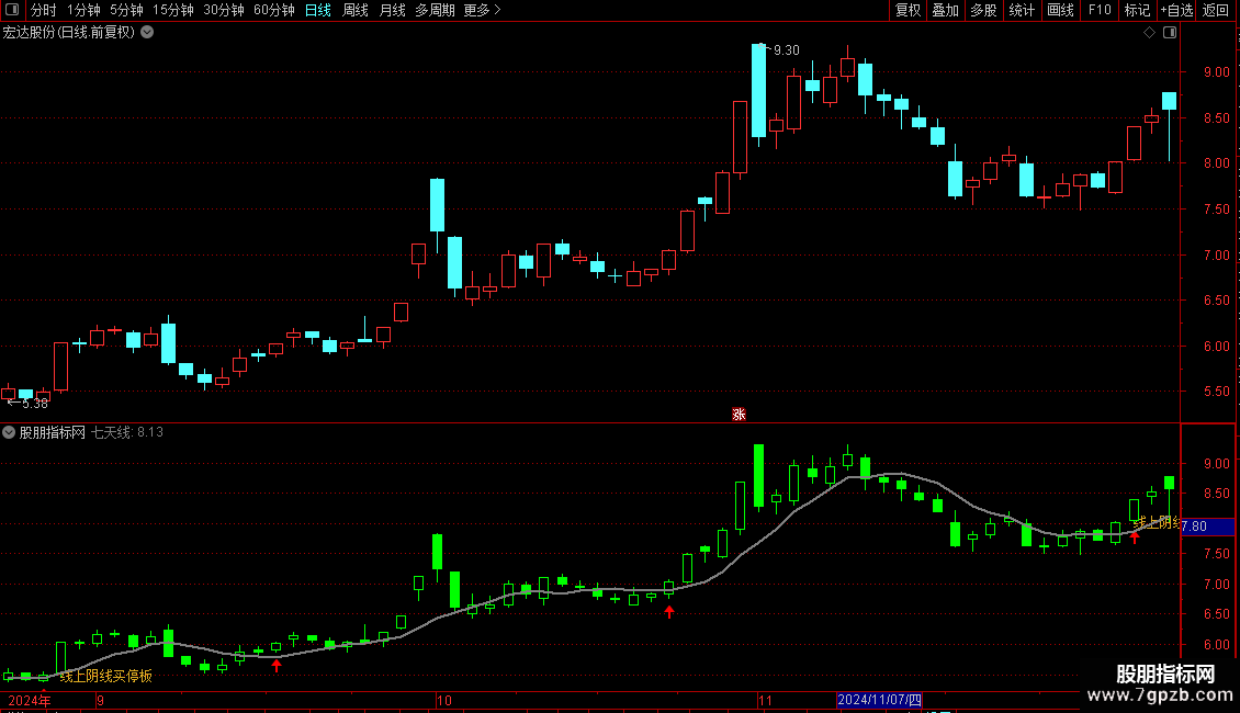 DRAWTEXT(CROSS(A4,A3),L,'线上阴线买停板'),LINETHICK4,COLOR22ACDE;