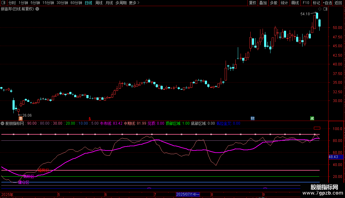 顶部区域:(中期线< REF(中期线,1) AND REF(中期线,1)>80) AND (REF(短期线,1)>95 OR REF(短期线,2)>95 ) AND 牛市线>60 AND 短期线< 83.5 AND 短期线< 中期线 AND 短期线< 牛市线+4;
