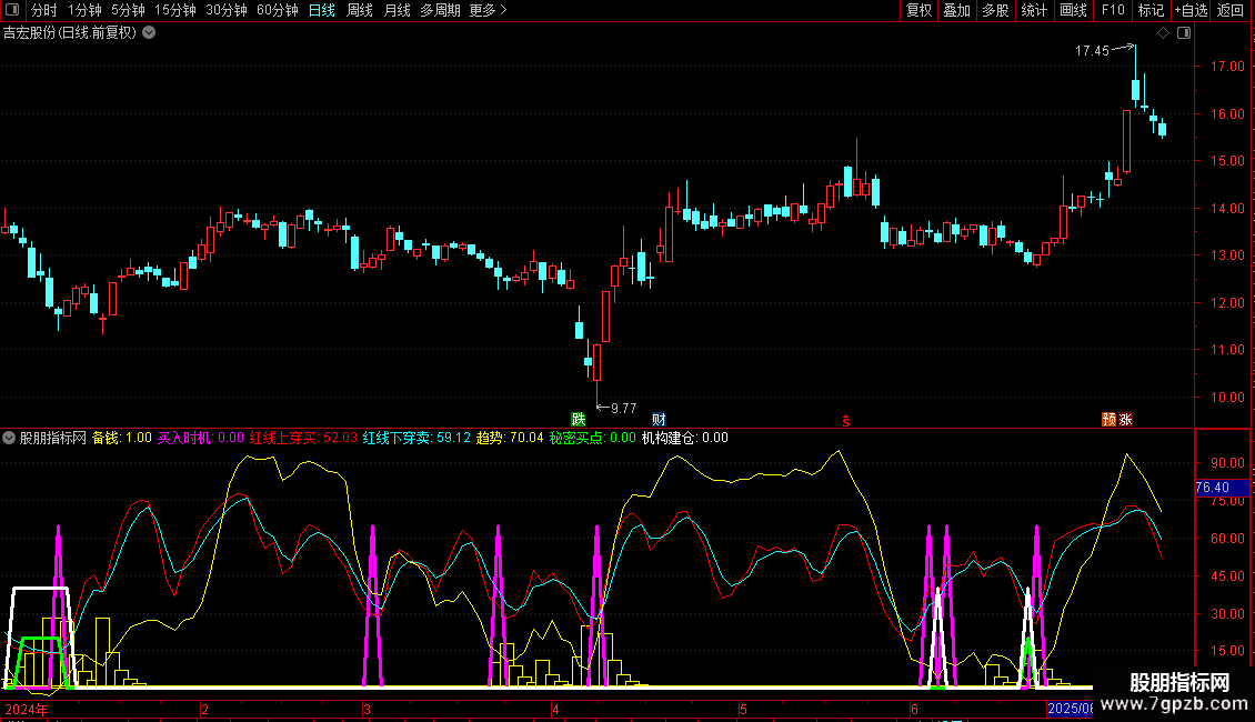 输出买入时机: 如果J上穿3,返回65,否则返回0,COLORFF00FF,线宽为3