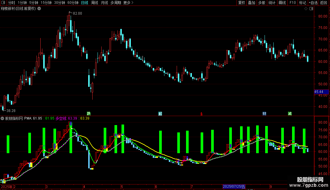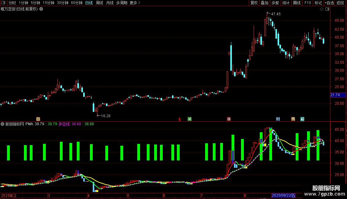 多空线:(20*X+19*REF(X,1)+18*REF(X,2)+17*REF(X,3)+16*REF(X,4)+15*REF(X,5)+14*REF(X,6)
