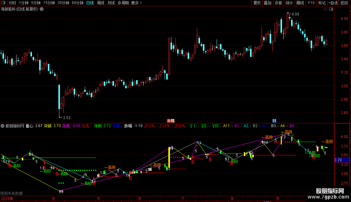 输出B4:当满足条件最低价<=55日内最低价的最低值时,在最低价位置画直线起点,当满足条件最高价>=55日内最高价的最高值时,在最高价位置画直线终点,0表示是否延长.