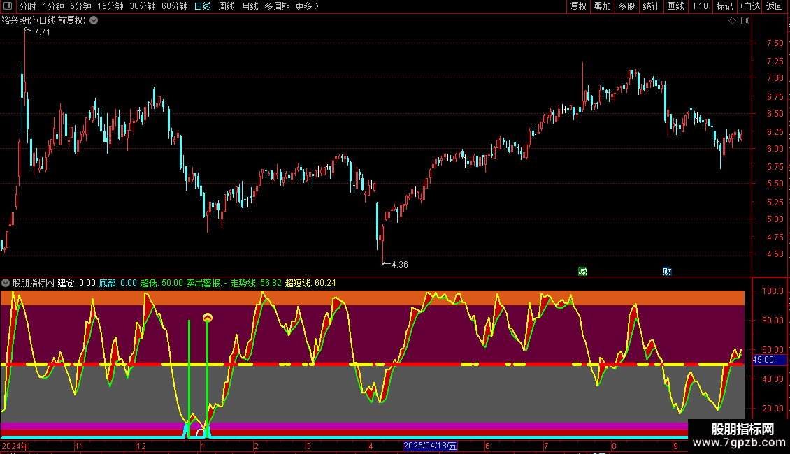 【底部侦测】副图,五层渐变色能量金字塔,独创“白-黄-绿”三级底部侦测信号