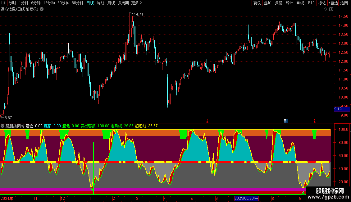 该指标利用五层渐变色带构建市场能量金字塔,搭配独创的“白-黄-”绿三级底部侦测系统,以及“千载难逢 + 箭头买点”双触发机制,结合量价强度带的视觉化多空转换,实现从极端超卖识别到趋势启动捕捉的全周期监控,精准把握市场底部信号,助力投资者高效决策。