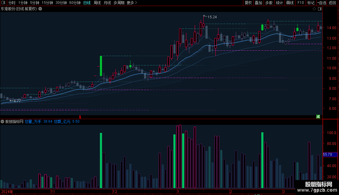 当满足条件TM=2ANDKXN=0时,在收盘价和开盘价位置之间画柱状线,宽度为2,0不为0则画空心柱.,COLOR604E3C