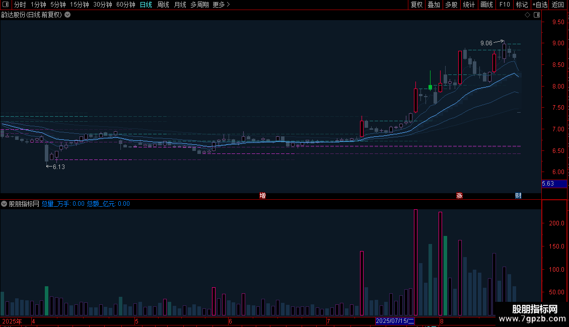 当满足条件TM=2ANDKXN=1时,在收盘价和开盘价位置之间画柱状线,宽度为2,1不为0则画空心柱.,COLOR805068