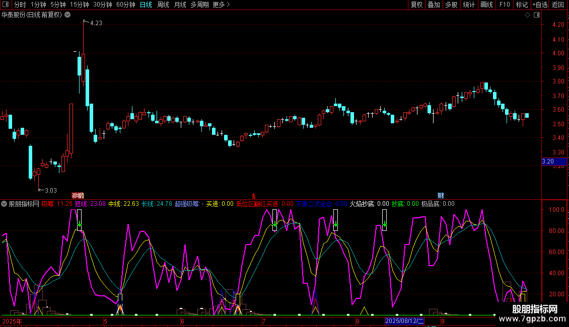 VAR8赋值:如果最低价<=VAR5,返回(VAR4+VAR6*2)/2,否则返回0的3日指数移动平均/618*VAR7