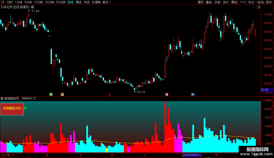 DRAWTEXT_FIX(CURRBARSCOUNT=1 AND COUNT(V>EMA(V,60),7)>=5 ,0,0.1,0,' 短期量能评定:'),COLORYELLOW;