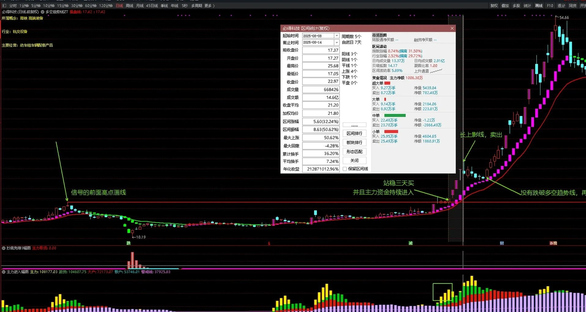 2买入:占上画线的第三天为买点,正常第一个买点(小阴小阳占上画线的),用好人好股老师的话说是 试盘。意思就是小阴小阳占上画线的第一个买点不买,抓第二个买点。当然涨停板突破画线,第二天又高开涨停的就不用等三天了。