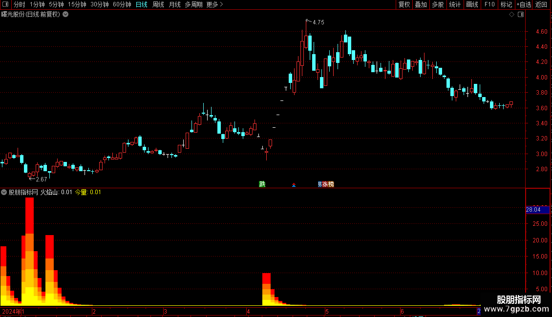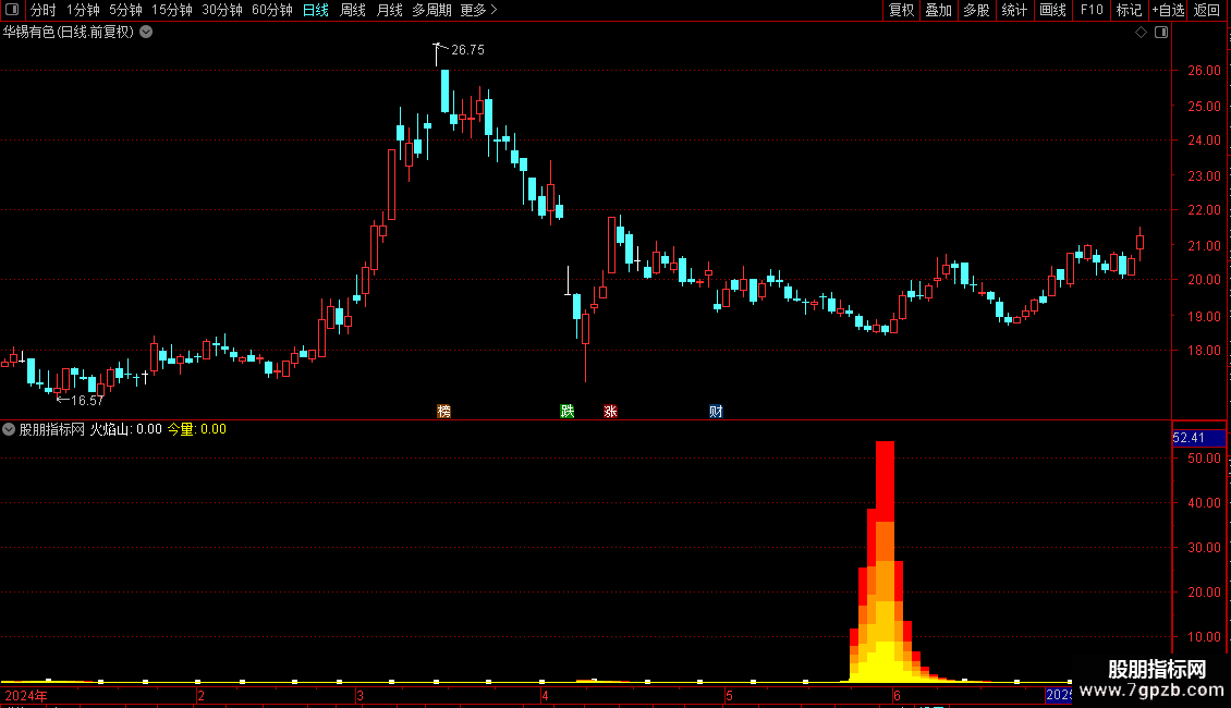 STICKLINE(火焰山>0,0,今量*0.2,8,0) COLOR00FFFF;