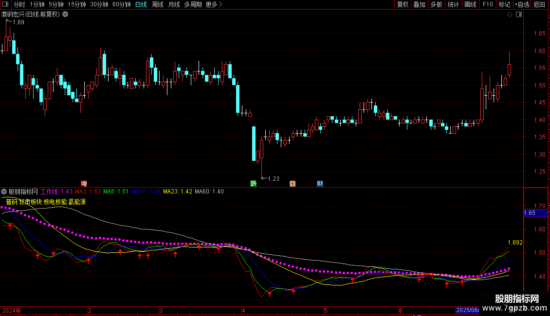 工作线:(EMA(C,40)),POINTDOT,LINETHICK5,COLORMAGENTA;