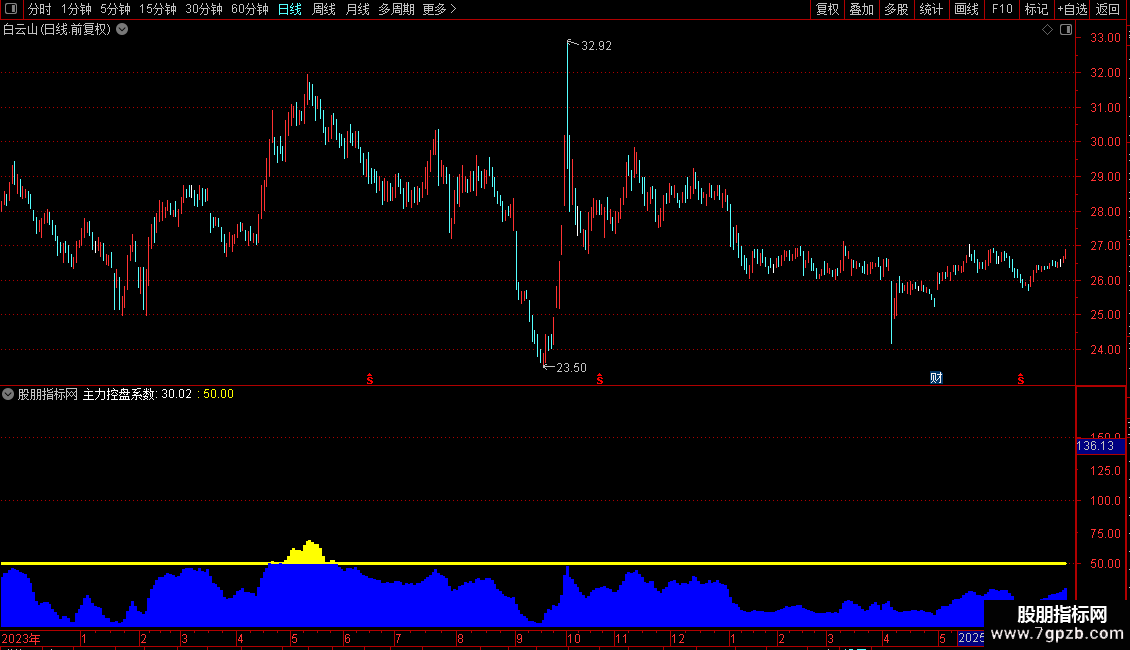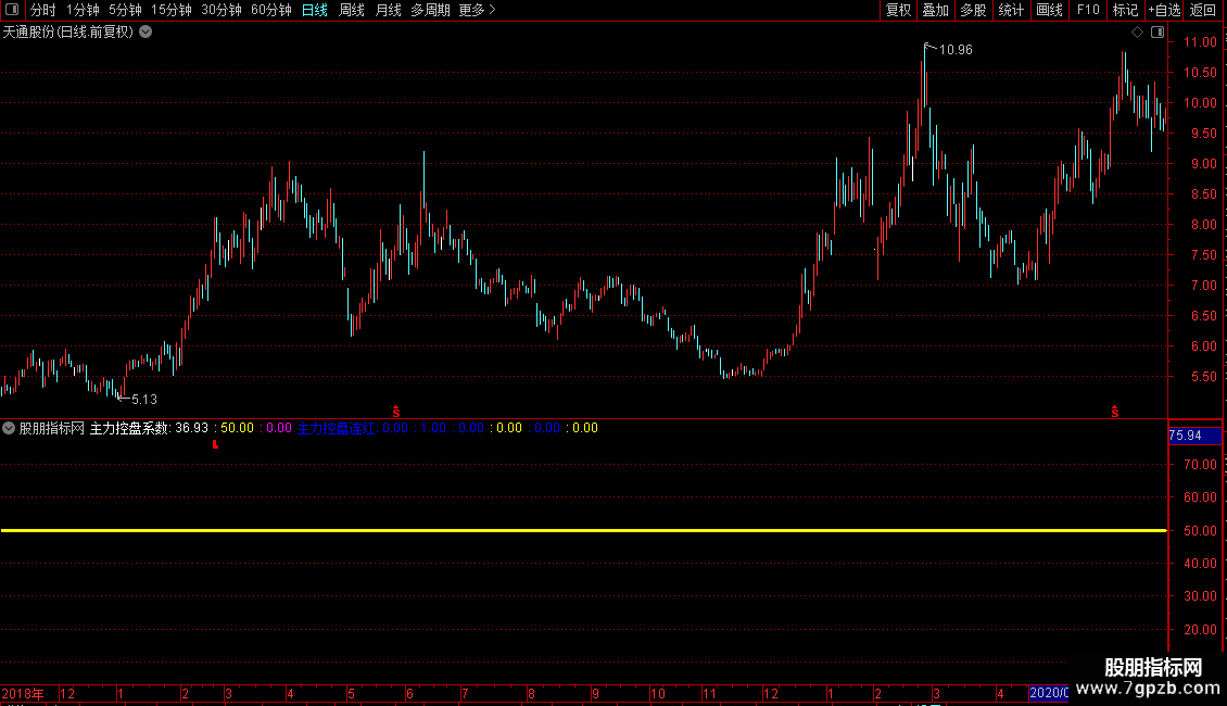 主力控盘连红:STICKLINE(ZZLKP>=75,50,0,2,0),COLORBLUE;
