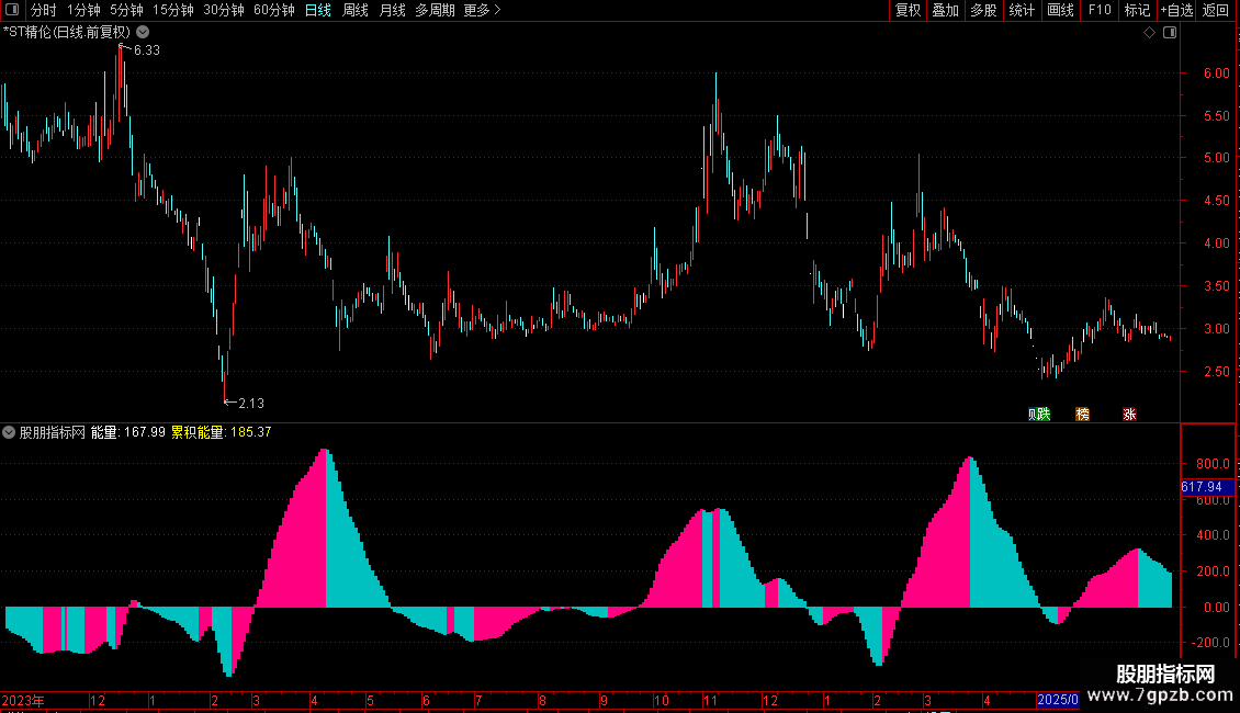 当满足条件累积能量>1日前的累积能量时,在0和累积能量位置之间画柱状线,宽度为2,0不为0则画空心柱.,画淡洋红色