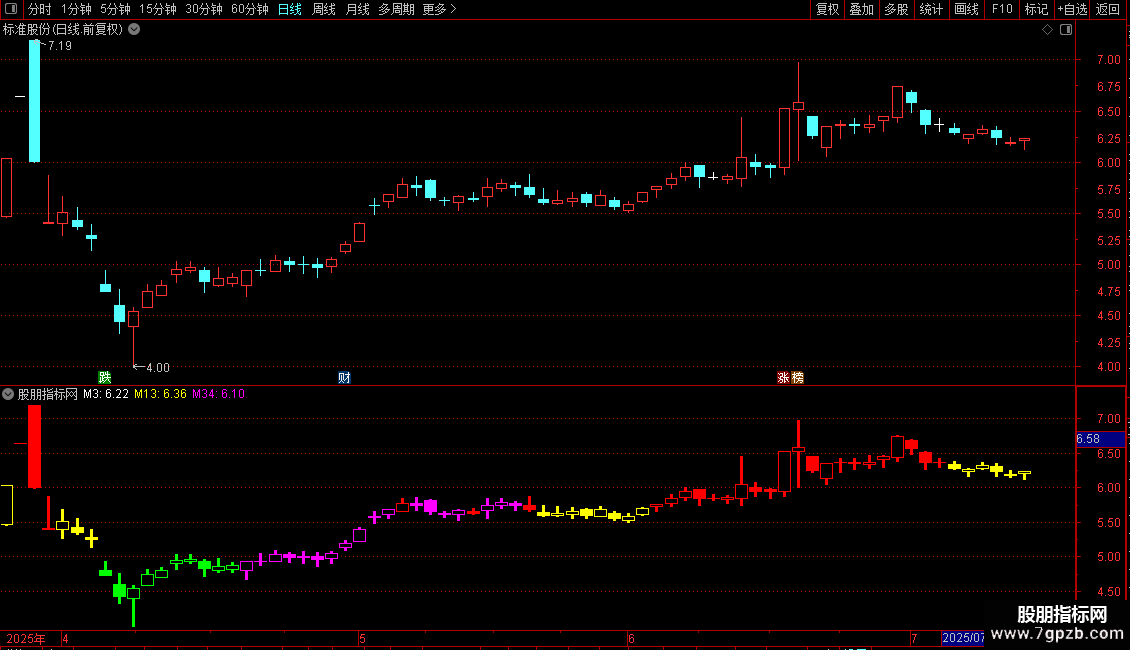 STICKLINE(M3<M13 AND M34>=REF(M34,1) ,H ,L ,0.1 ,0 ),COLORYELLOW;