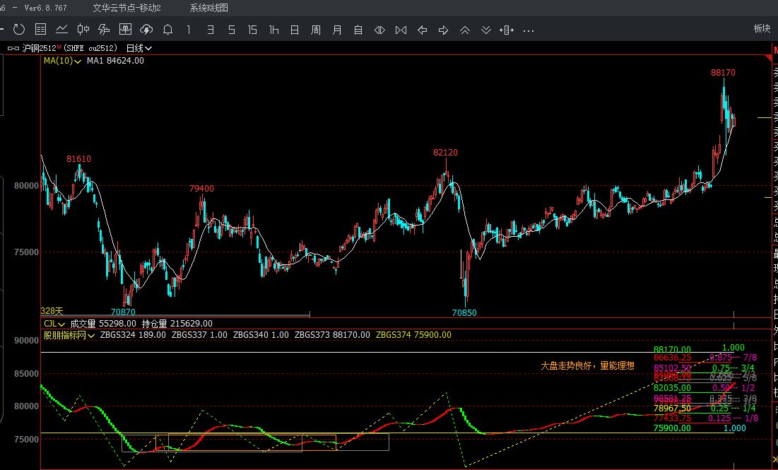 DRAWTEXT(T22=1 AND CURRBARSCOUNT=70,AAA-(AAA*0.03),'大盘走势良好,量能理想'),COLORFF9900 ;