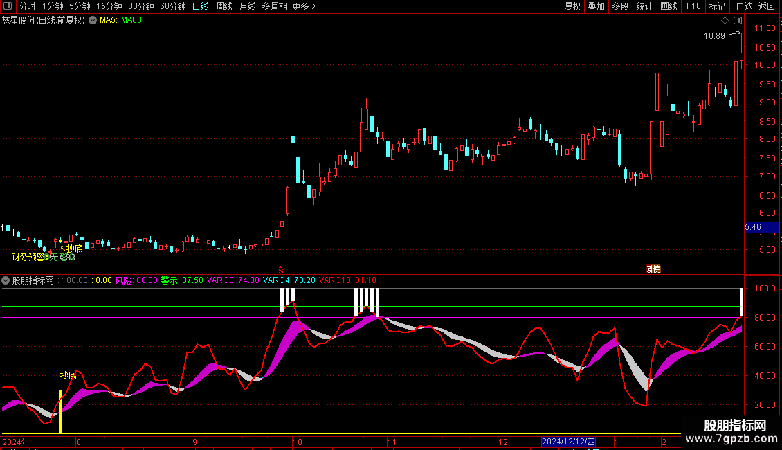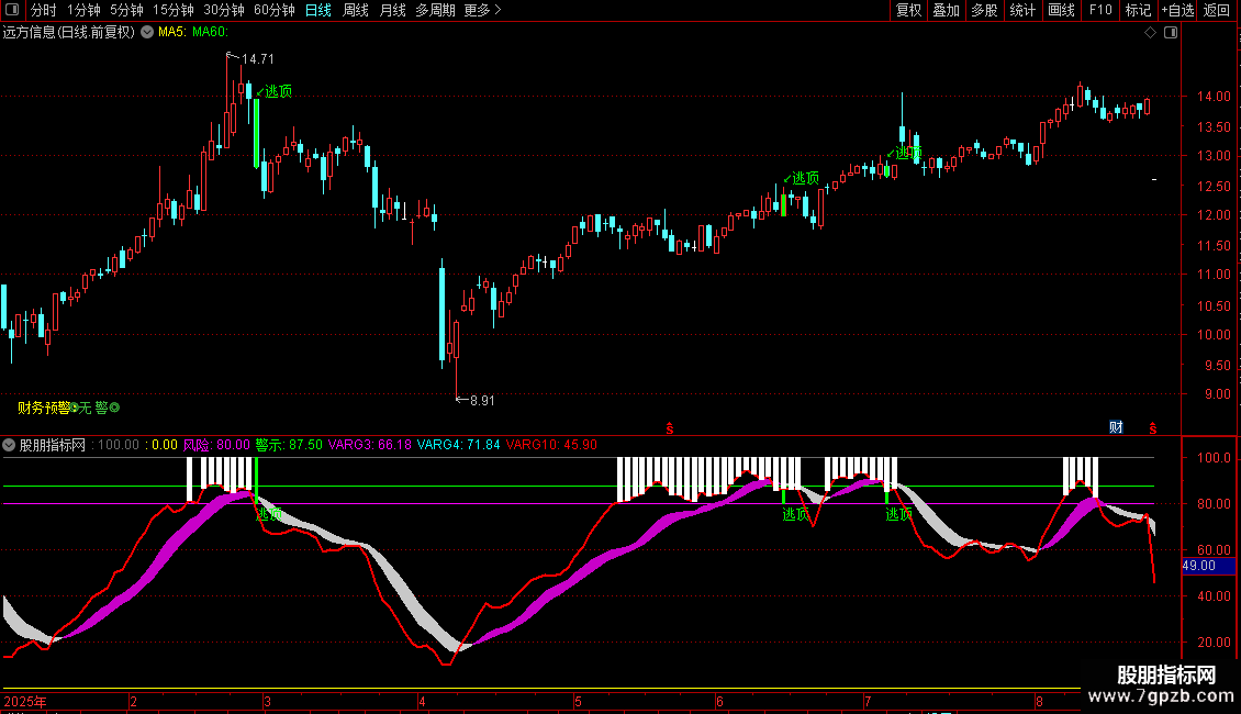 指标通过36日高低点计算股价相对位置,用三条信号线(紫、黄、蓝)判断买卖点。当紫线上穿黄线且处于低位时显示“抄底”信号(黄色柱状提示),适合逢低买入;当黄线下穿紫线且处于高位时显示“逃顶”信号(绿色柱状提示),建议分批减仓。风险线(80)和警示线(87.5)区域用彩色带标记,超买时需警惕回调。操作上,抄底信号出现可轻仓试多,逃顶信号出现应逐步止盈,结合成交量验证更稳妥。