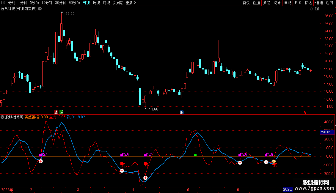红线自下而上上穿蓝线时,适当关注,主力数字增加时可持股,相反就减仓。