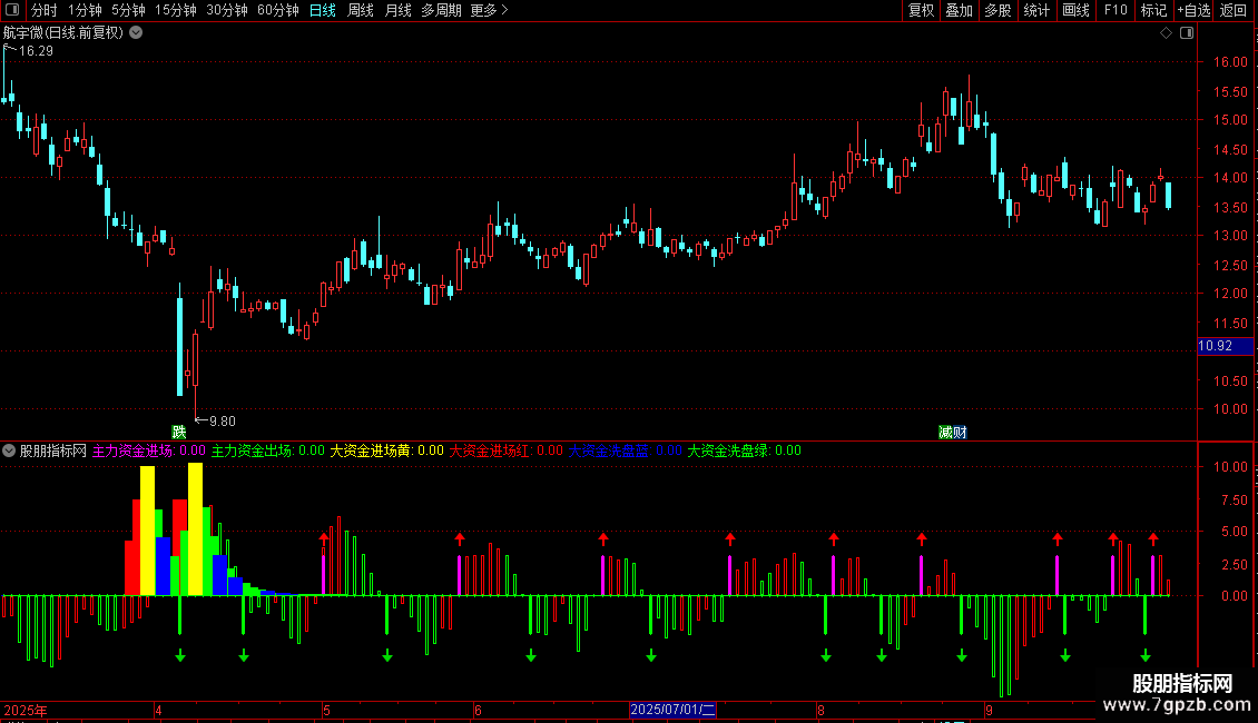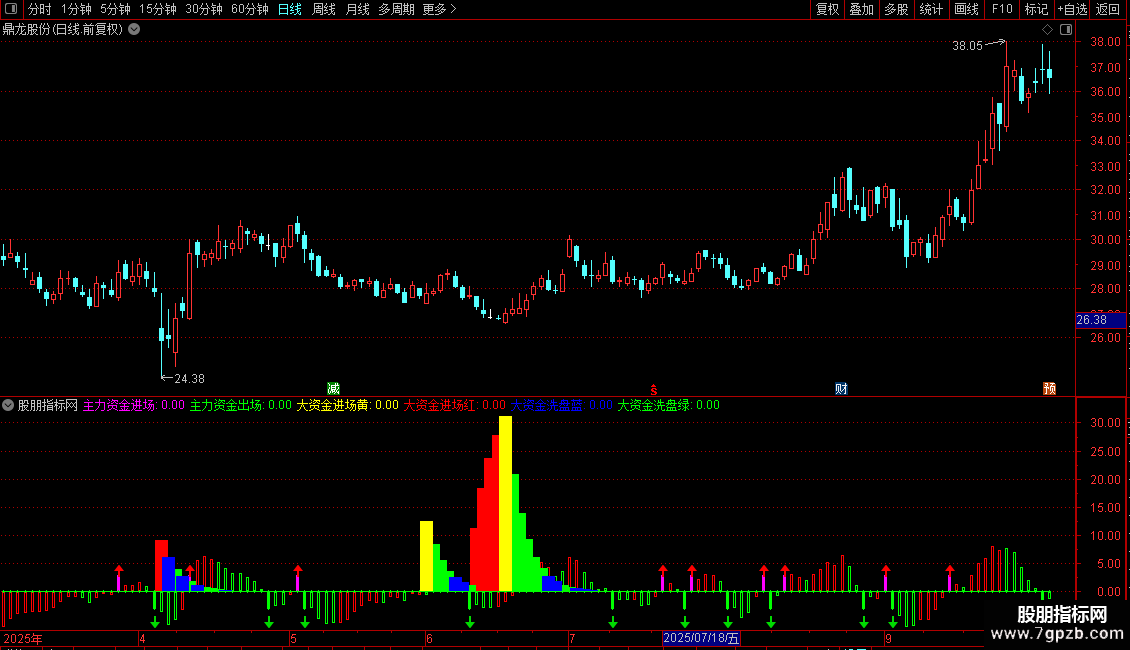 洗盘:STICKLINE(VAR5<REF(VAR5,1),0,VAR5,7,0),COLORGREEN; 主力进场阳:STICKLINE(VAR5>REF(VAR5,1) AND C>O,0,VAR5,7,0 ),COLORYELLOW;