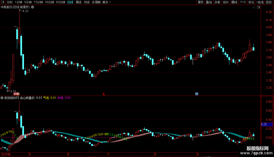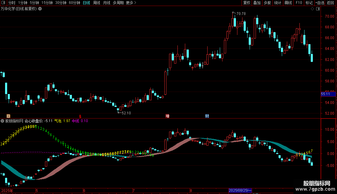 VAR1Z:=REF(MA(C,20),10);开:=O-VAR1Z,NODRAW;高:=H-VAR1Z,NODRAW;低:=L-VAR1Z,NODRAW;会心收盘价:C-VAR1Z,NODRAW;MID:=(3*会心收盘价+低+开+高)/6;红线:=(20*MID+19*REF(MID,1)+18*REF(MID,2)+17*REF(MID,3)+16*REF(MID,4)+15*REF(MID,5)+14*REF(MID,6)+13*REF(MID,7)+12*REF(MID,8)+11*REF(MID,9)+10*REF(MID,10)+9*REF(MID,11)+8*REF(MID,12)+7*REF(MID,13)+6*REF(MID,14)+5*REF(MID,15)+4*REF(MID,16)+3*REF(MID,17)+2*REF(MID,18)+REF(MID,20))/210,COLORLIRED;绿线:=MA(红线,6),COLORLIGREEN;X1:=ABS(红线)/0.9,COLORBROWN;气泡:IF(红线<=0,X1,DRAWNULL),COLORYELLOW,NODRAW;中线:IF(红线<0,(X1+红线)/2,DRAWNULL),COLORMAGENTA,DOTLINE;DRAWBAND(绿线,RGB(0,124,124),红线,RGB(155,96,96));DRAWKLINE(高,开,低,会心收盘价);ZP:=红线<=0 AND 气泡>REF(气泡,1);天数:DRAWNUMBER(ZP,气泡,BARSLAST(REF(红线,1)>0 AND 红线<0)),COLORYELLOW;ZP1:=红线<=0 AND 气泡<REF(气泡,1);天数1:DRAWNUMBER(ZP1,气泡,BARSLAST(REF(气泡>REF(气泡,1),1) AND 气泡<REF(气泡,1))),COLORGREEN;