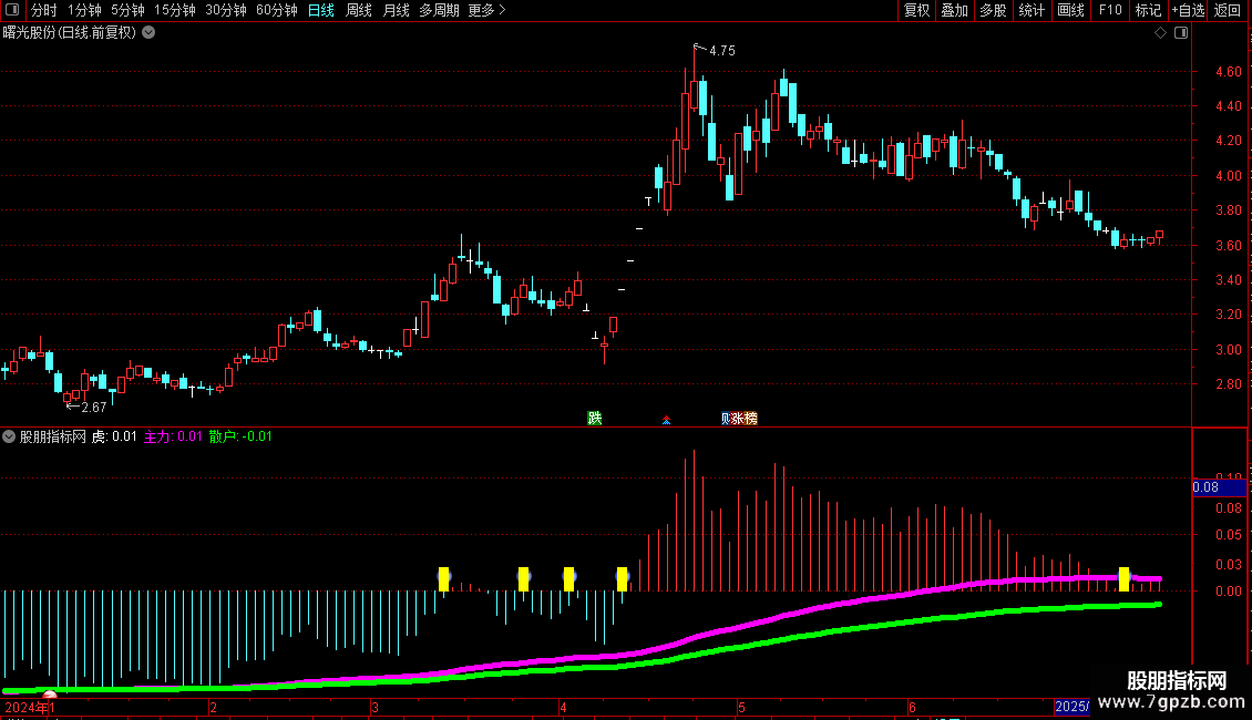 主力:EXPMA( (EXPMA(CLOSE,500)-REF(EXPMA(CLOSE,500),1))/REF(EXPMA(CLOSE,500),1)*100,120)-0.0004,LINETHICK5,COLORMAGENTA;