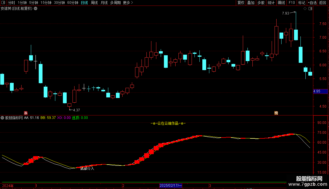 DRAWTEXT(CROSS(AA,22) AND BB<AA,AA-2,'*底部介入');