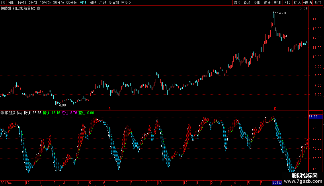 蓝柱:IF((快线 - 慢线) < 0,(ABS(快线 - 慢线)),0),LINETHICK0;