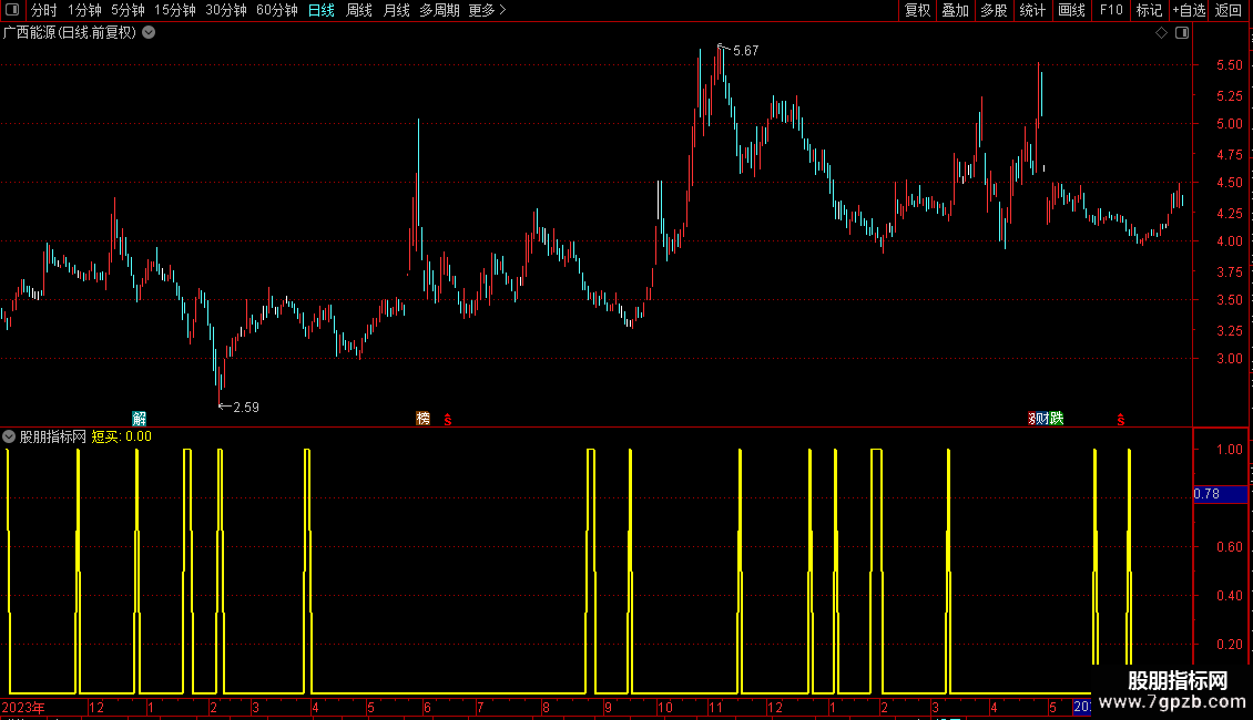 输出短买:如果5日内(你<买卖)的最低值,返回1,否则返回0,COLOR00FFFF 线宽为2