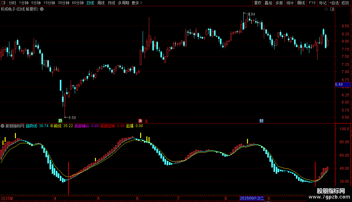 紫色柱状线:代表底部确认信号,表明股价可能已处于底部区域。
