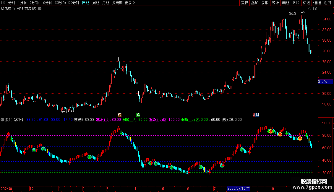 弱势主力:IF(波段3,20,DRAWNULL),DOTLINE,COLORGREEN;