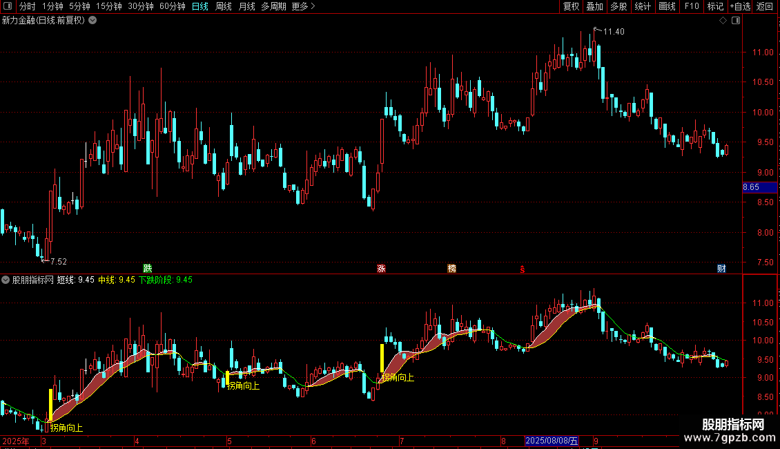 下跌阶段:IF( VAR2=VAR7, VAR7,DRAWNULL),COLORGREEN;
