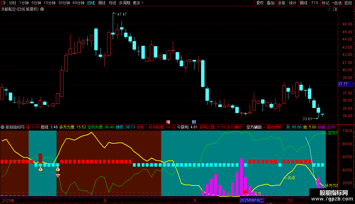 空方辅助:IF(CURRBARSCOUNT>5,DRAWNULL,VAR45)COLORWHITE,LINETHICK2;