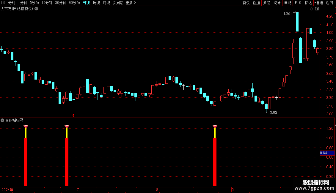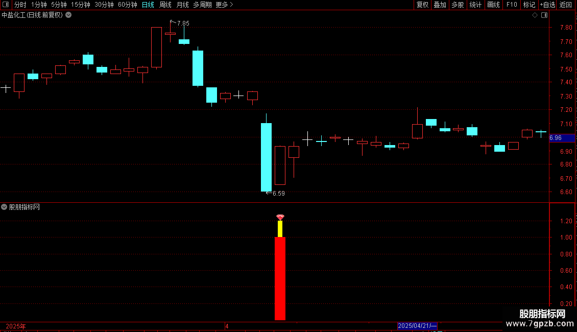 注:指标通过叠加短、中、长周期超卖状态,避免单一周期误判;黄色柱体为初步警示,红色柱体+三角图标为确认信号,建议结合日线成交量及板块效应验证。