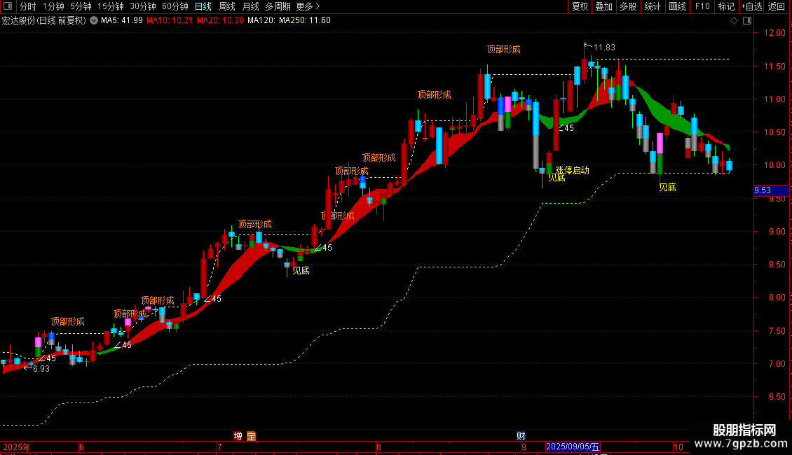 支撑:MA(REF(LLV(C,30),1),2),COLORABFF46,DOTLINE;