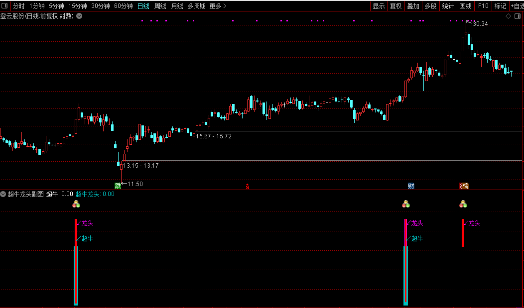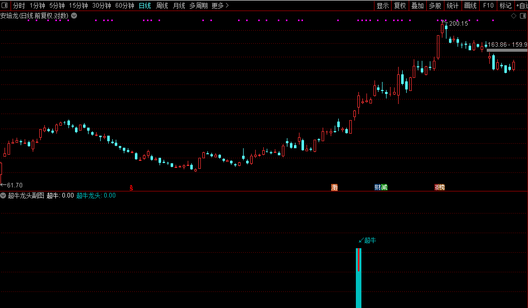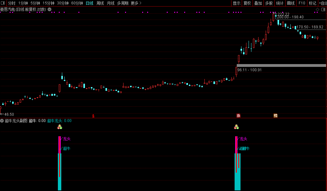 使用方法:当副图出现"龙头"和"超牛"文字提示及彩色柱状线时,表明符合强势条件。投资者可结合个股基本面、行业热点等因素综合判断,在趋势确认后适时介入,并设置好止损位控制风险。