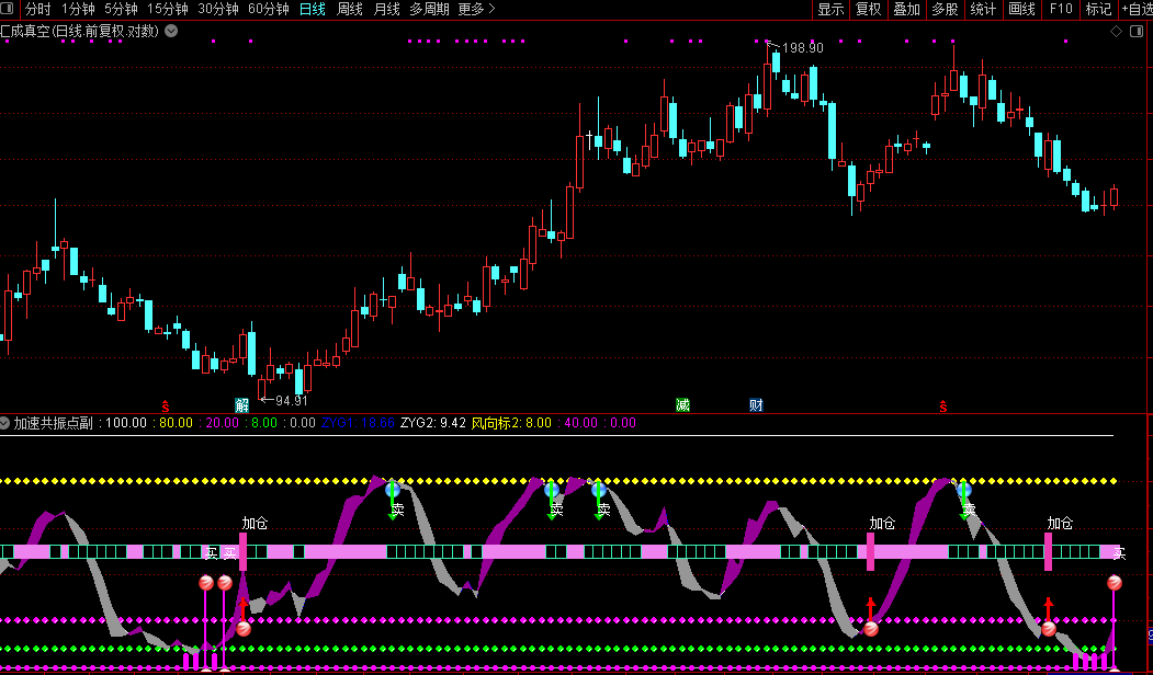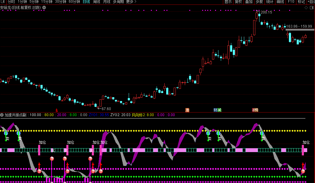 指标设有20、80和8三条关键参考线,分别对应加仓、卖出和买入信号。当指标由下向上突破8时,标记买入信号;突破20时提示加仓机会;当指标从高位下穿80时,则发出卖出警示。此外,指标还通过彩色柱状线和图标直观标示买卖点,帮助投资者快速把握股价的加速启动和转折时机。