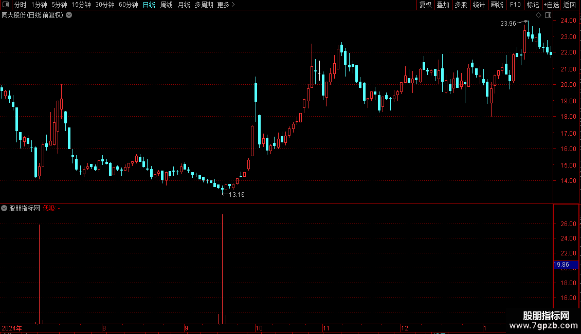 低吸:IF(TJ > 10, EMA(IF(LOW <= VARE , (VARD + VARF * 2) / 2, 0), 3) / 618 * VAR10 * 0.5, DRAWNULL), COLORSTICK, COLORRED;