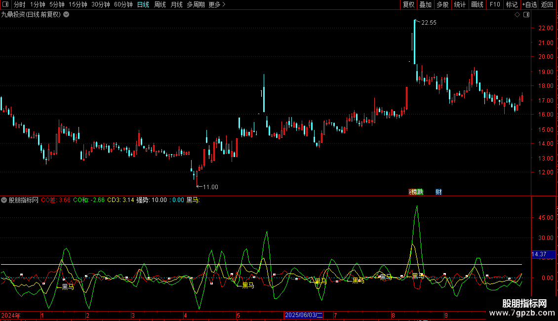 CO和:MA(REF(CJD+OJD,1),3),COLORGREEN;
