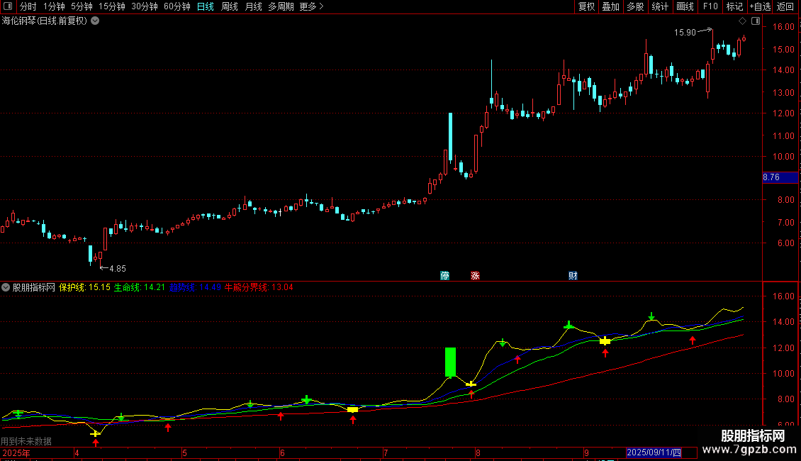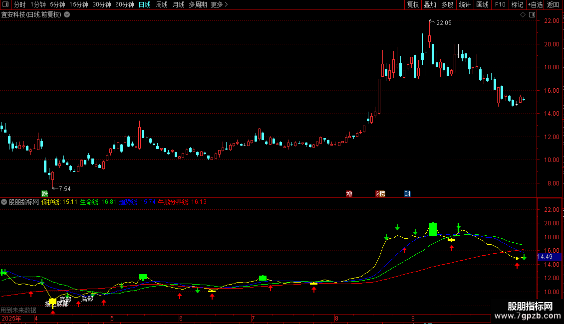 DRAWICON((ZIG(3,5)>REF(ZIG(3,5),1)) AND (REF(ZIG(3,5),1)<=REF(ZIG(3,5),2)) AND (REF(ZIG(3,5),2)<=REF(ZIG(3,5),3)),LOW*0.98,1) ;DRAWICON((ZIG(3,5)<REF(ZIG(3,5),1)) AND (REF(ZIG(3,5),1)>=REF(ZIG(3,5),2)) AND (REF(ZIG(3,5),2)>=REF(ZIG(3,5),3)),HIGH*1.01,2);VAR3:=(CLOSE-MA(CLOSE,6))/MA(CLOSE,6)*100;VAR4:=(CLOSE-MA(CLOSE,24))/MA(CLOSE,24)*100;VAR5:=(CLOSE-MA(CLOSE,32))/MA(CLOSE,32)*100;VAR6:=(VAR3+VAR4+VAR5)/3;VAR7:=EMA(VAR6,5);ZB:=EMA(EMA(VAR3,5),5)*3, COLORSTICK;VAR8:=IF(VAR6<=-20,10,0);VAR9:=HHV(VAR8,10);VARA:=IF(VAR9 AND CROSS(MA(CLOSE,3),MA(CLOSE,5)),20,0);K:=EMA(VAR7,5)*2, , COLORFF00FF;D:=EMA(K,5), , colorwhite;J:=K*3-D*2, ,coloryellow;VARB:=BETWEEN(CLOSE,MA(CLOSE,3),MA(CLOSE,5)) AND J>10;HS:=VOL/CAPITAL*100, , colorgreen;DRAWTEXT(VAR8=10 AND FILTER(VAR8=10,5),LOW*0.93,'接近底部');DRAWTEXT(VARA=20,LOW*0.95,'底部');保护线:MA(C,3),coloryellow;生命线:MA(C,21),colorgreen;趋势线:MA(C,12),colorblue; 牛熊分界线:MA(C,55),colorred; VAR1:=ZIG(3,10)<REF(ZIG(3,10),1) AND REF(ZIG(3,10),1)>REF(ZIG(3,10),2); VAR2:=ZIG(3,10)>REF(ZIG(3,10),1) AND REF(ZIG(3,10),1)<REF(ZIG(3,10),2);STICKLINE(VAR1,C,O,8,0),colorgreen,LINETHICK2;STICKLINE(VAR1,C,O,3,0),colorgreen,LINETHICK2; STICKLINE(VAR1,H,L,1,0),colorgreen,LINETHICK2; STICKLINE(VAR2,C,O,8,0),coloryellow,LINETHICK2; STICKLINE(VAR2,C,O,3,0),coloryellow,LINETHICK2; STICKLINE(VAR2,H,L,1,0),coloryellow,LINETHICK2;