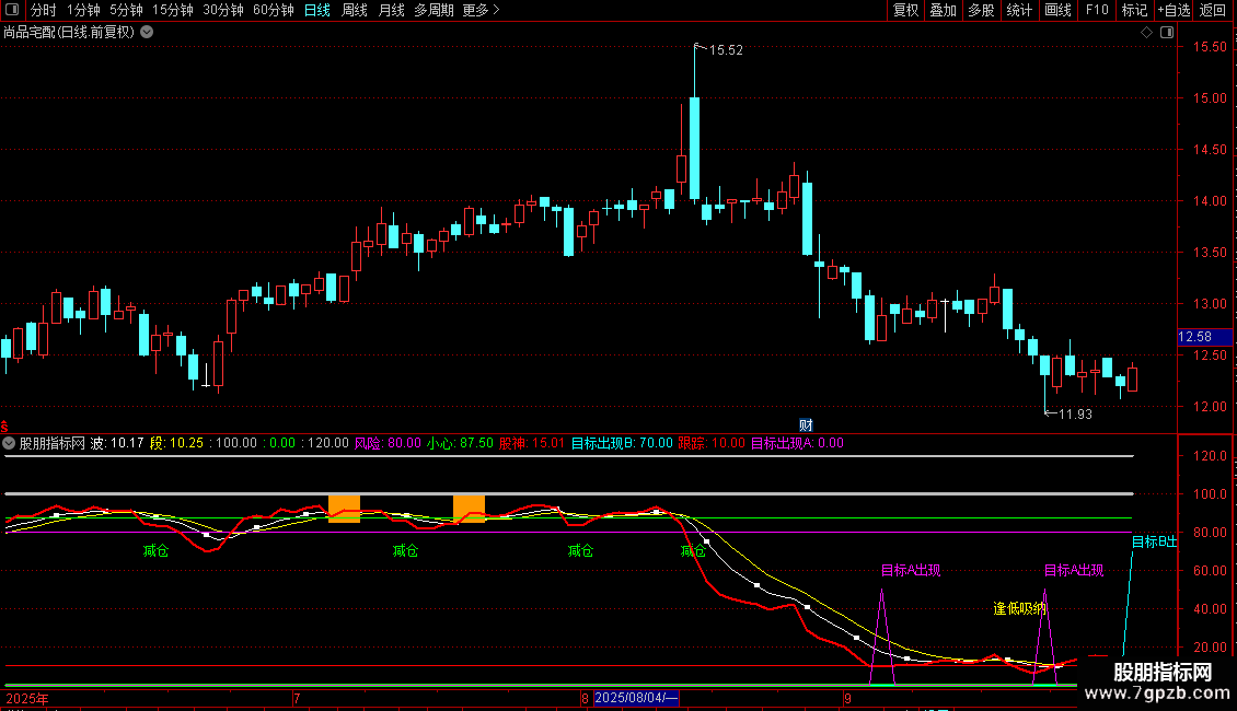 DRAWTEXT(CROSS(股海,90) AND (股神<40),75,'目标B出现'),COLORFFFF00;