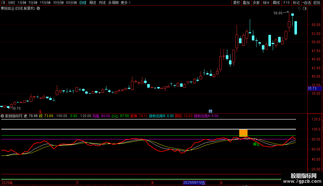 目标出现A:IF((COUNT((股神>REF(股神,1)),1)=1) AND (REF(股神,1)<REF(REF(股神,1),1)) AND (股神<跟踪),50,0),COLORF00FF0;