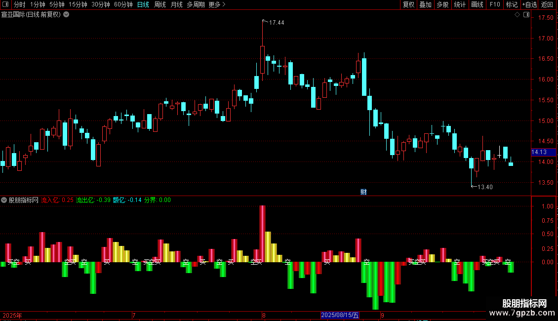 STICKLINE(YUWEI<0 AND YUWEI>REF(YUWEI,1),0,YUWEI,4,0)COLOR080E71;