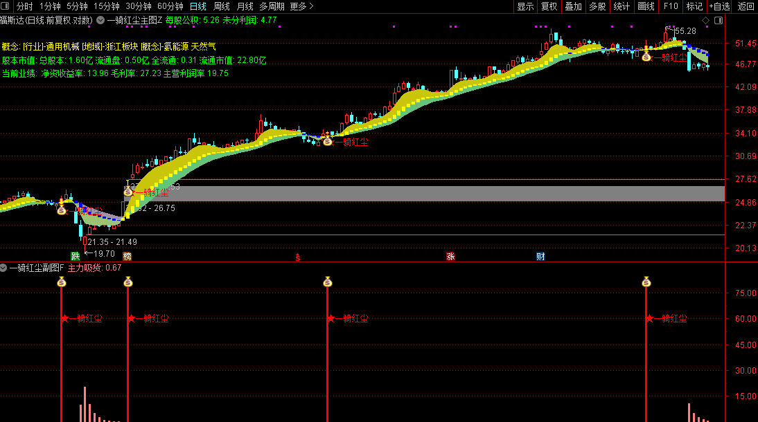 1 主图黄色柱提示向上趋势+副图提示有主力吸货,当有主力吸货后出现"一骑红尘"的信号,意味着即将起飞,可低吸介入。
